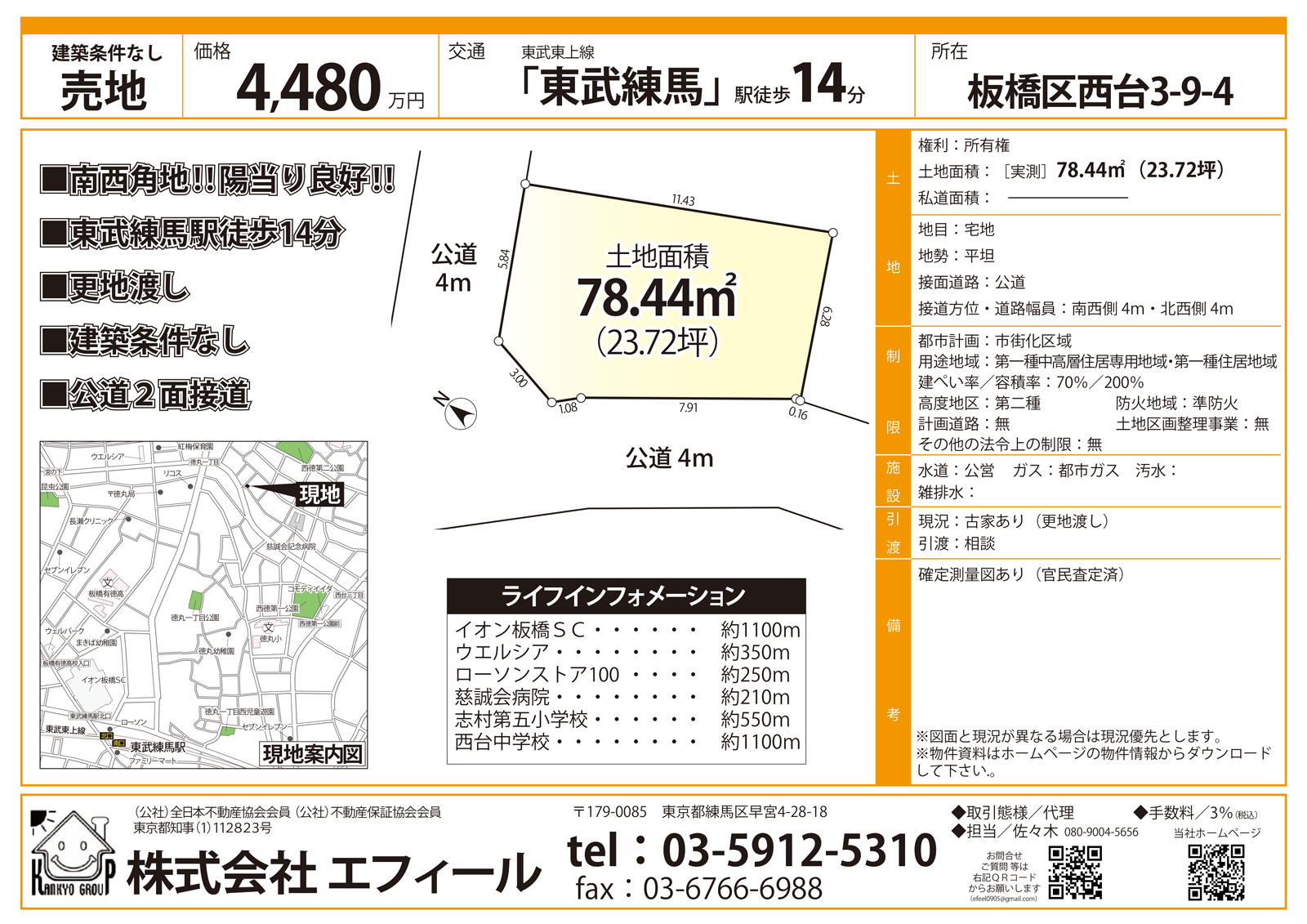 北側約4.3m公道東側約4.0m私道(接道位置指定あり)